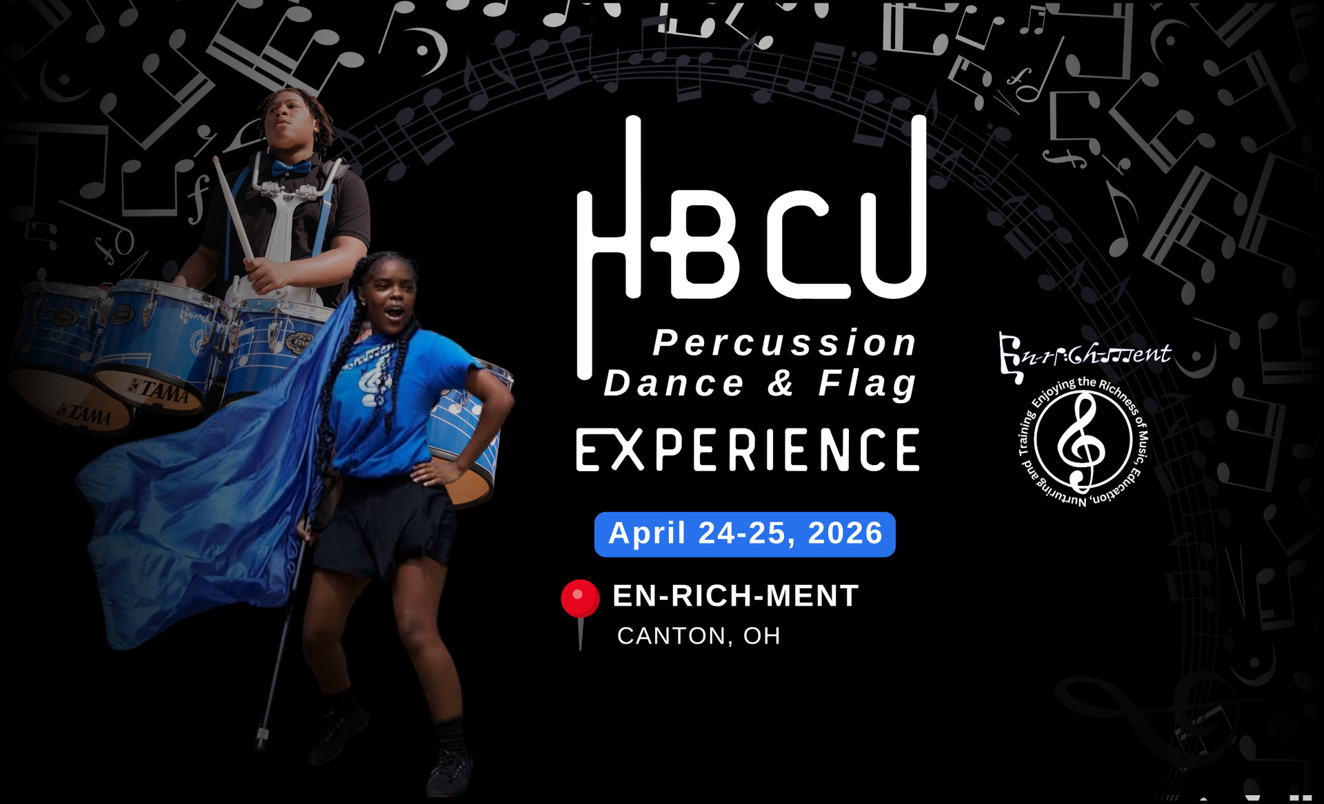 Join us April 24–25th as guest instructors from top HBCU organizations nationwide bring authentic drumming, dance, and flag training to EN-RICH-MENT! This high-energy experience is open to students ages 5-18, educators, and community members alike. Learn More & Register + View Sponsorship Opportunities.